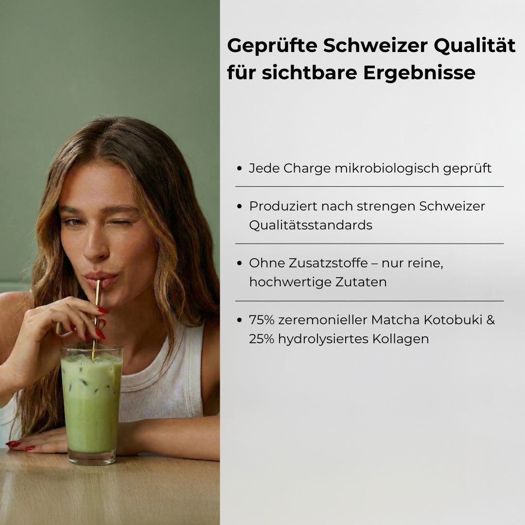 Ceremonial Matcha aus Japan trifft auf hydrolysiertes Kollagen für spürbare Energie ohne Koffein-Crashes und eine Haut, die sich straffer, glatter und frischer anfühlt.